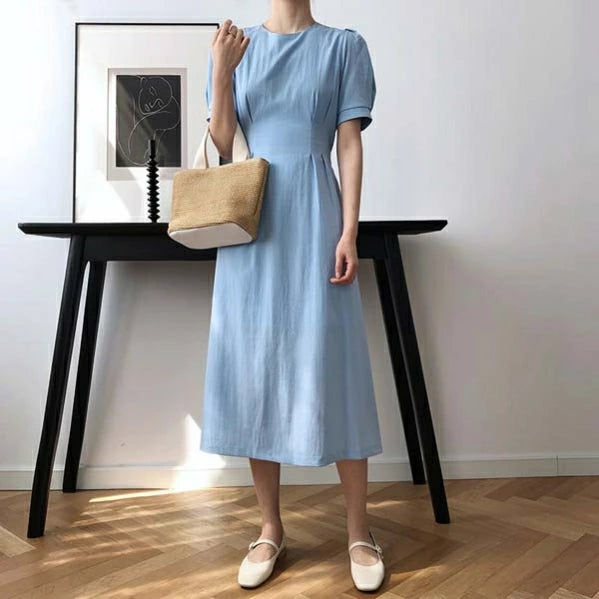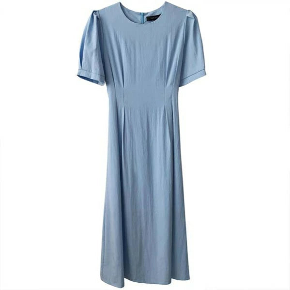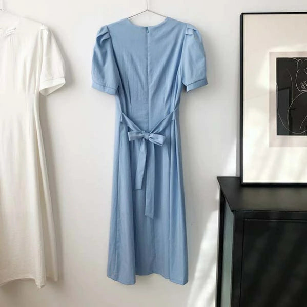 ワンピース Aライン 着痩せ パフスリーブ レディース ロングワンピース 春夏 半袖 リボン付き 無地 ブルー おしゃれ